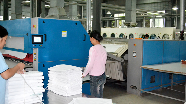 洗衣房機(jī)器的智能化大大降低了人力成本,經(jīng)過自動折疊機(jī)的床單十分工整。